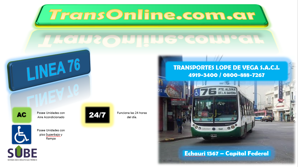 Foto: fotolog.com/bondis_grosos LINEA 76 TRANSPORTES LOPE DE VEGA S.A.C.I. 4919-3400 / 0800-888-7267 ECHAURI 1567 CAPITAL FEDERAL FLOTA: -Esta empresa Cuenta con unidades con Aire Acondicionado -Esta empresa Cuenta con una flota uniformemente carrozada bajo chasis super bajo con rampa para discapacitados y sillas de rueda -Esta empresa Cuenta con lectoras de tarjeta SUBE -Esta empresa NO Cuenta con unidades "Articuladas" Recorrido: (Fuente: C.N.R.T.)